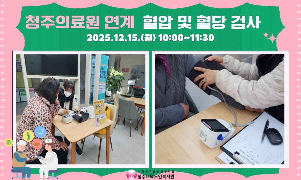 2025년 12월 15일 월요일, 오전10시부터 청주내덕노인복지관 1층 로비에서 청주의료원과 연계한 혈압 및 혈당 검사가 진행되었습니다. 충청북도청주의료원 공공보건의료협력팀과 연게하여 진행된 혈압 및 혈당 검사를 통해 건강을 체크하고 수치에 따라 상담도 받아볼 수 있었습니다.
