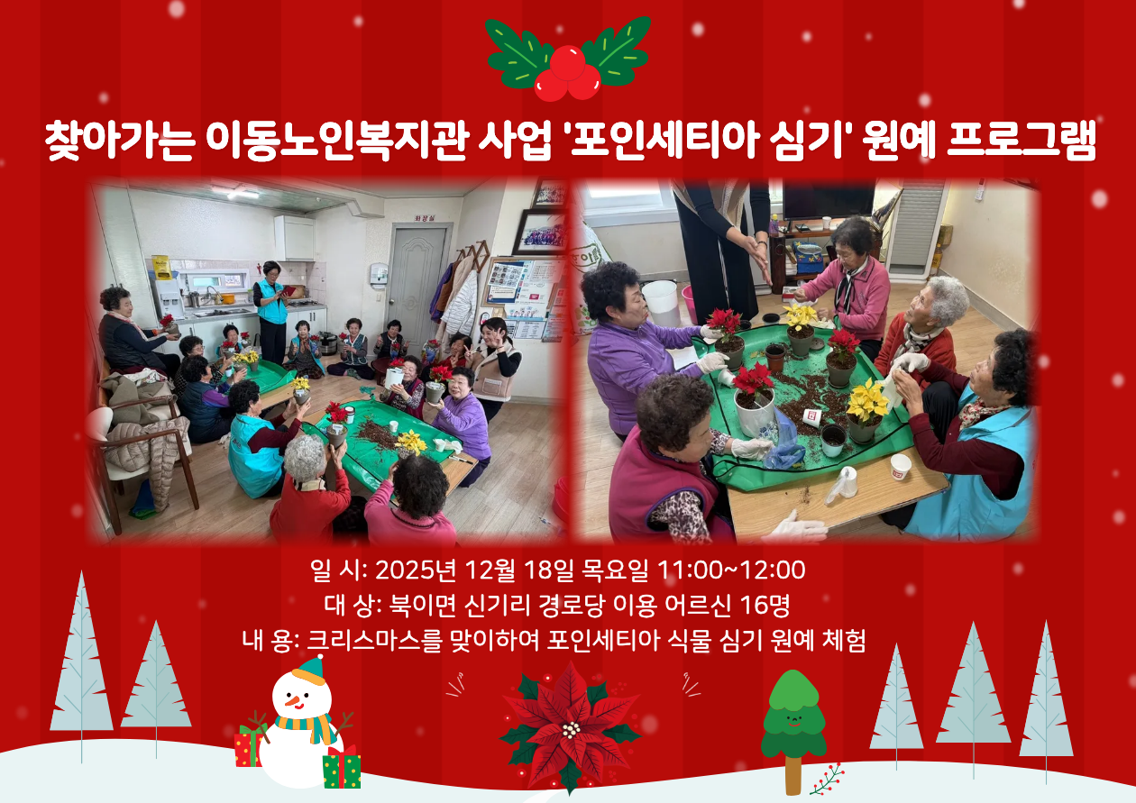 북이면 신기리 경로당 이용 어르신 대상으로 찾아가는 이동노인복지관사업-포인세티아 심기 원예 프로그램을 진행하였습니다. 이번 프로그램은 크리스마스를 맞아 어르신들께 계절의 즐거움을 느낄 수 있는 원예 체험 활동을 제공하고, 정서적 안정과 소통의 시간을 마련하고자 기획되었습니다. 프로그램 인원을 10명으로 정하여 6분이 더 오셨는데, 윤화원 사장님께서 6개의 포인세티아를 더 지원해주셔서 모든 어르신들이 프로그램에 참여할 수 있었습니다.