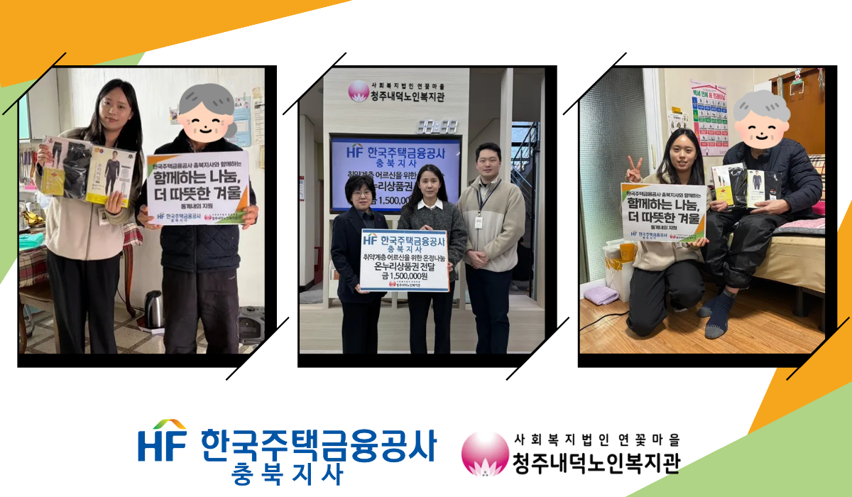 이번 지원이 원활하게 진행될 수 있도록 따뜻한 나눔을 실천해주신 한국주택금융공사 충북지사에 깊이 감사드리며, 청주내덕노인복지관은 앞으로도 지역 어르신의 건강하고 안전한 겨울나기를 위해 지속적으로 지원하겠습니다!!