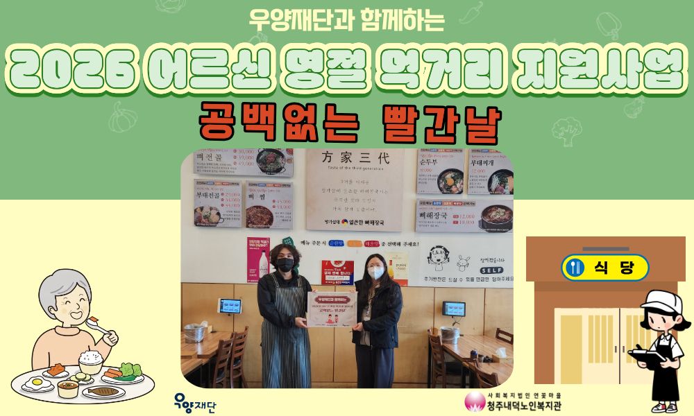청주내덕노인복지관은 우양재단에서 지원하는 2026년 어르신 명절 먹거리 지원사업 '공백없는 빨간날'에 선정되어 청주 율량동에 위치한 '방가삼대 얼큰한 뼈해장국 율량점'과 연계해 연휴 기간에도 든든한 식사를 하실 수 있도록 결식이 우려되는 저소득 독거 어르신 30명을 대상으로 1인당 2만원 상당의 식사쿠폰을 전달하였습니다. 어르신들은 명절 연휴기간에도 신경써줘서 고맙다며, 쿠폰 잘 사용하겠다는 인사를 해주셨습니다. 앞으로도 어르신들이 식사 공백에 어려움을 겪지 않도록 지원하도록하겠습니다.