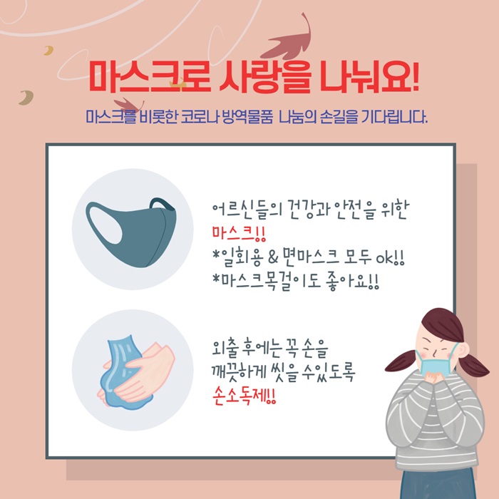 취약계층 어르신 사랑의 마스크 나누기 모금캠페인! 네이버 해피빈 모금함 바로 가기 https://happybean.naver.com/donations/H000000174005