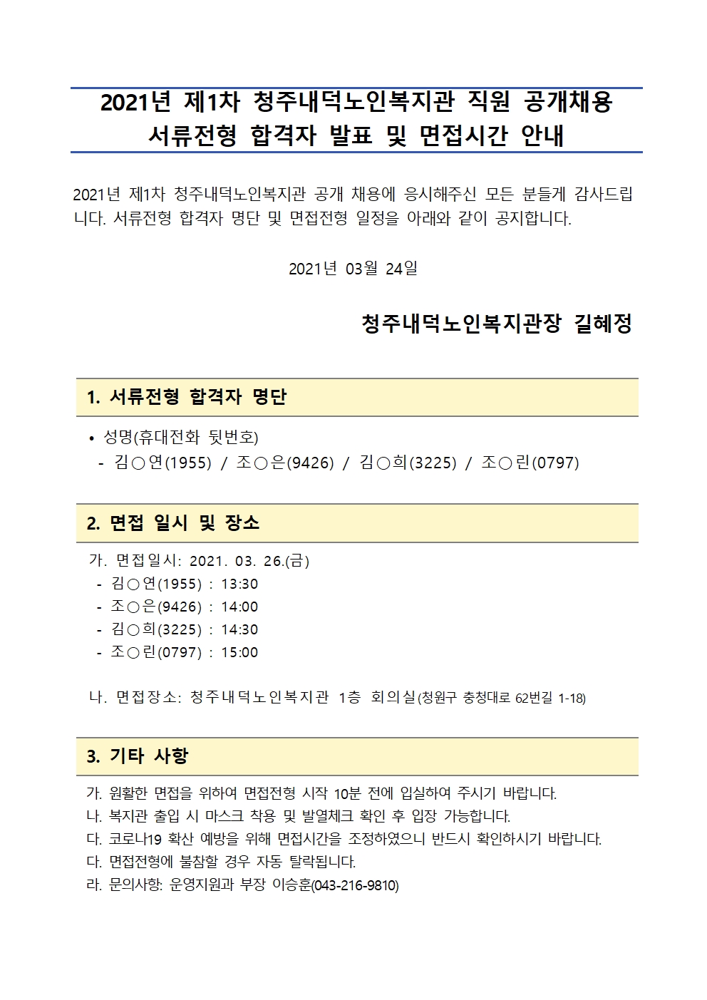 | 2021년 제1차 직원 공개채용 서류전형 합격자 및 면접시간 안내 | |||