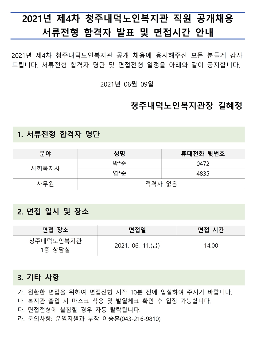 | 2021년 제4차 직원 공개채용 서류전형 합격자 및 면접시간 안내 | |||