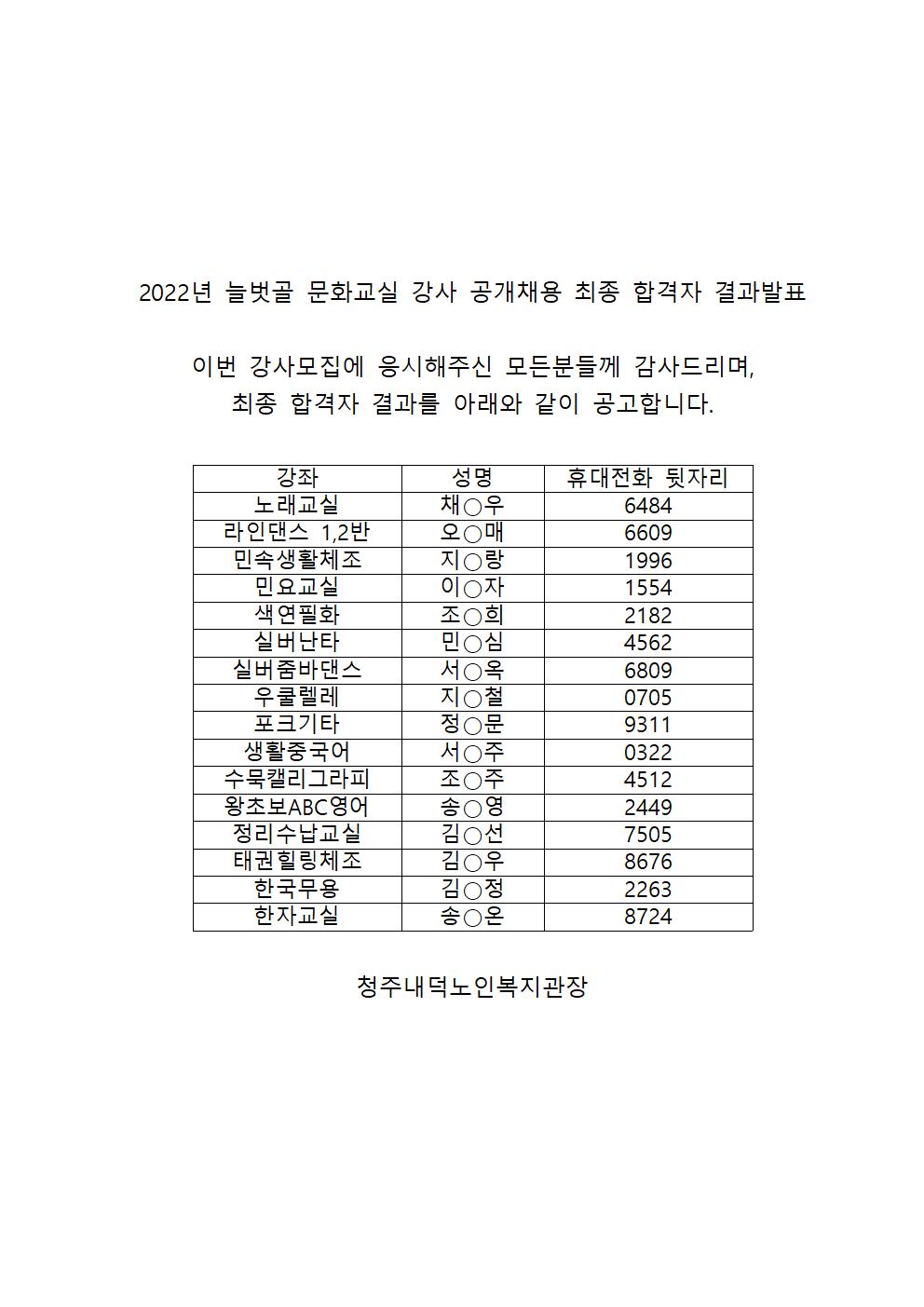 | 2022년 늘벗골 문화교실 강사 채용 최종 합격자 발표 | |||