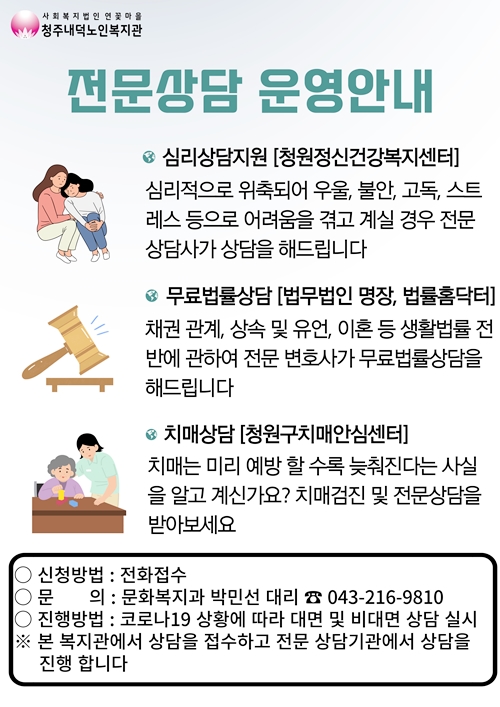 복지관에서는 전문상담 운영을 실시합니다. 현재 대면 서비스 운영 중단으로 전화신청 바랍니다. 심리상담, 법률상담, 치매상담 등을 실시하오니 도움이 필요하면 언제든지 문의 주시길 바랍니다. 담당자 1차 상담 후 전문 상담 기관에 연계 할 예정입니다. 보건복지부 및 지자체 사회적거리두기 지침 완화로 정상 개관 할 경우 대면 및 비대면으로 지속적인 상담이 진행될 예정이오니 많은 관심과 참여 바랍니다. |