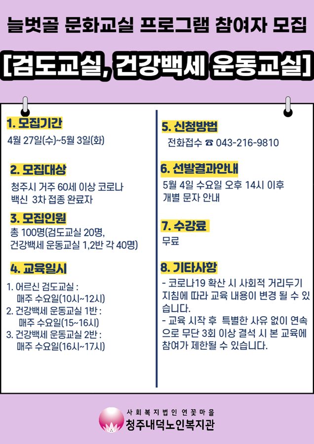 | 2022년 늘벗골 문화교실 프로그램(어르신 검도교실, 건강백세운동교실) 참여자 모집 | |||