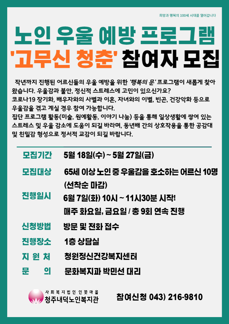| [모집] 노인 우울예방 프로그램 참여자 모집 | |||