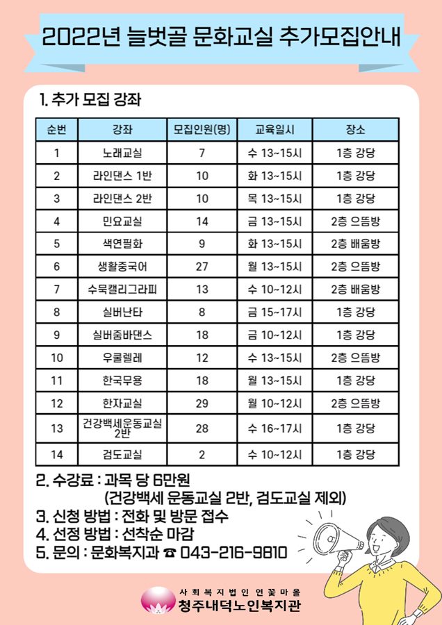 | [추가 모집] 2022년 늘벗골 문화교실 수강생 모집 | |||