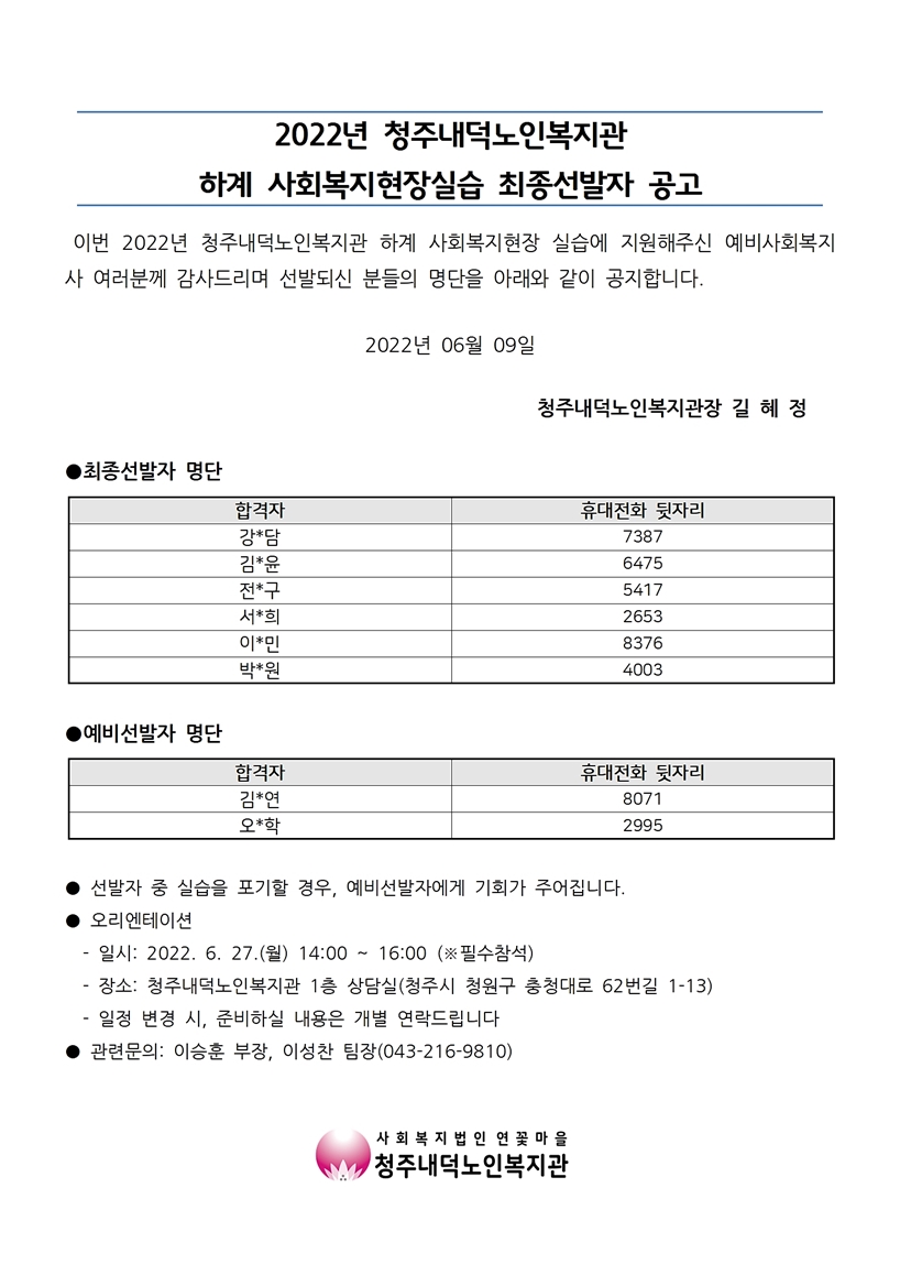| 2022년 하계 사회복지현장실습 최종선발자 공고 | |||