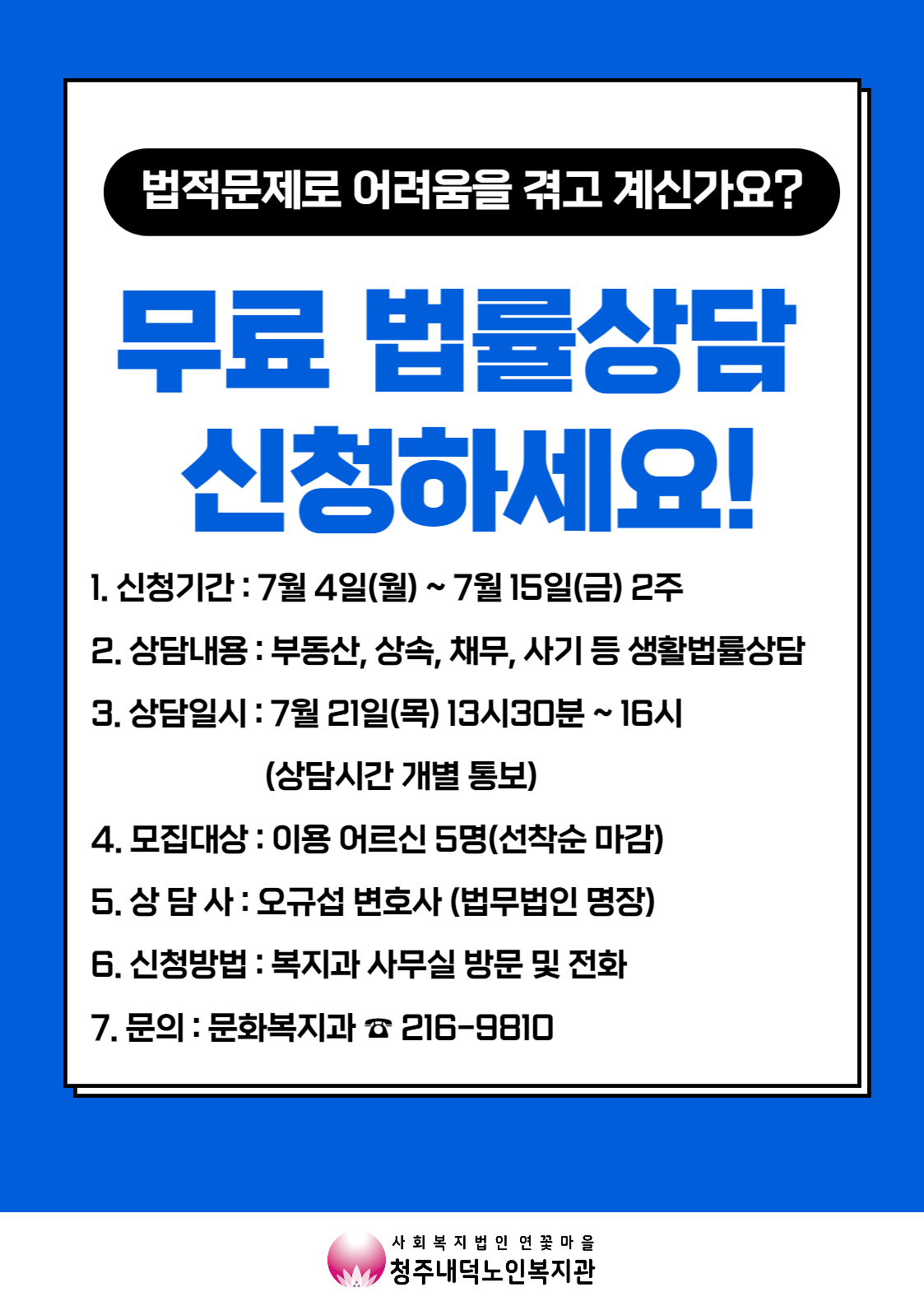 | [전문상담 신청안내] 무료법률상담 참여자 모집 | |||