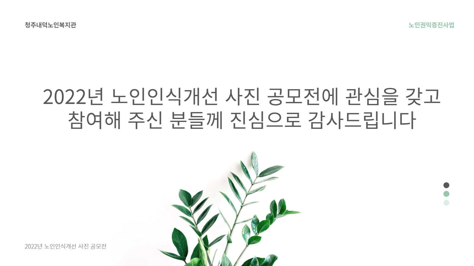 2022년 노인인식개선 사진 공모전 심사결과를 안내 드립니다. 시상은 별도로 진행되지 않으며 입상하신 분에게는 별도로 안내를 드리도록 하겠습니다 관심을 갖고 참여해주신 분들께 진심으로 감사드립니다. |