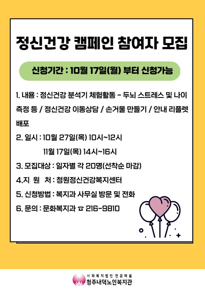 두뇌 스트레스 및 나이 측정/ 정신건강상담/ 손거울 만들기 등 정신건강 캠페인 참여자를 모집하고자 하오니 많은 관심과 참여를 바랍니다 |