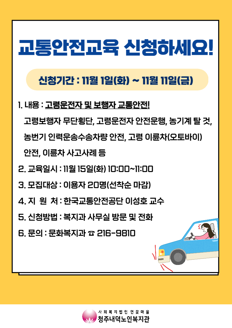 고령운전자 및 보행자 교통안전교육 참여자를 모집하오니 많은 관심과 참여를 바랍니다!