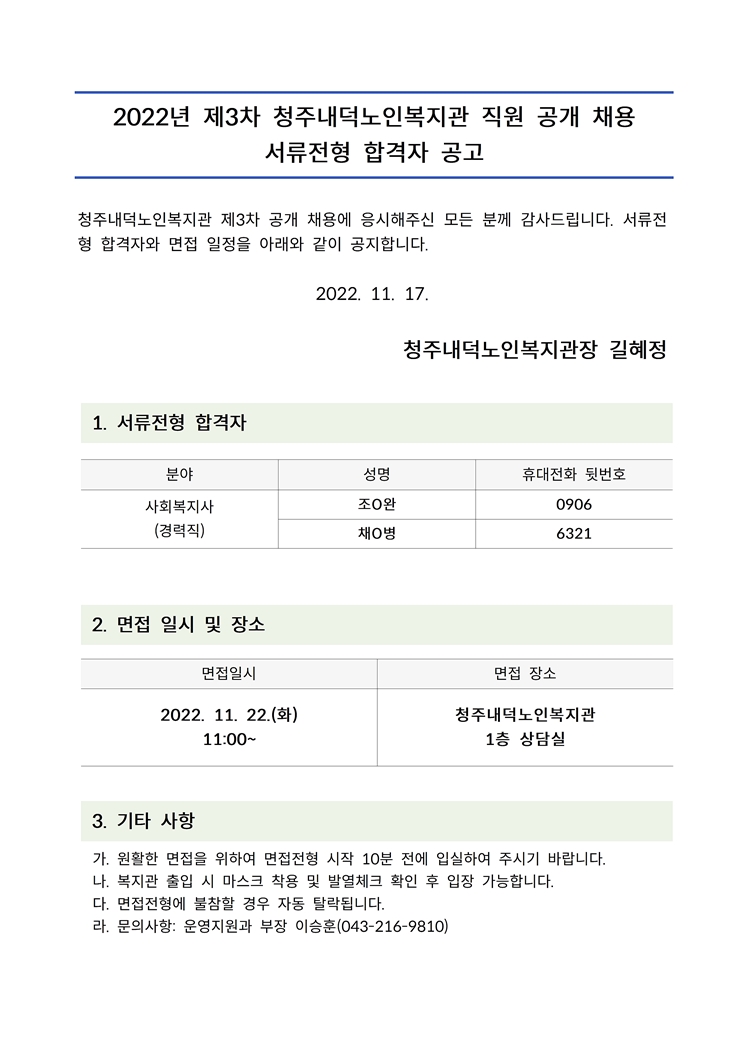 | 2022년 제3차 직원 공개채용 서류전형 합격자 및 면접시간 안내 | |||