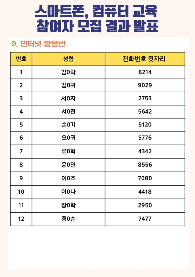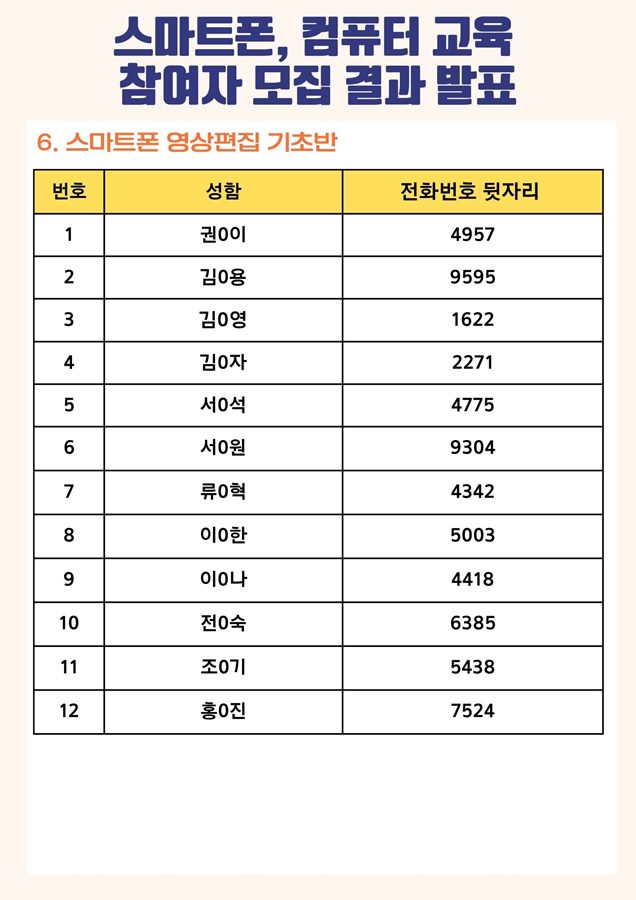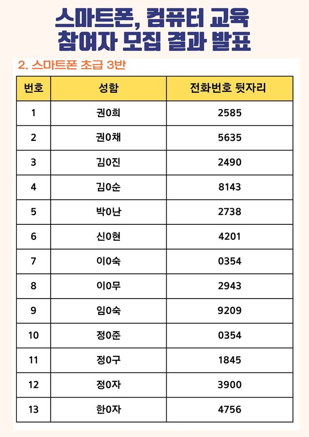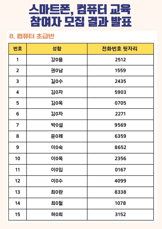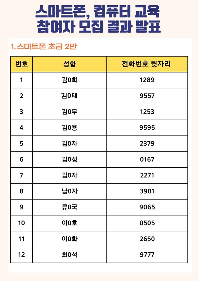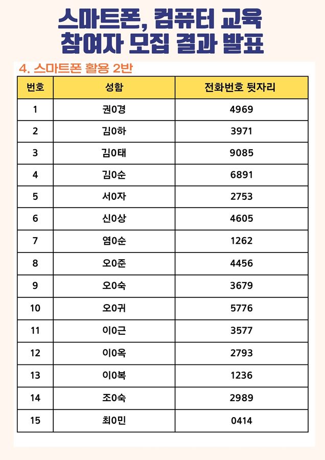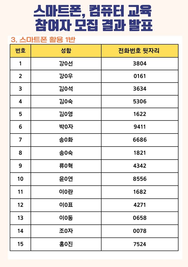 | [모집결과] 2023년 스마트폰, 컴퓨터 교육 참여자 모집 결과 안내 | |||