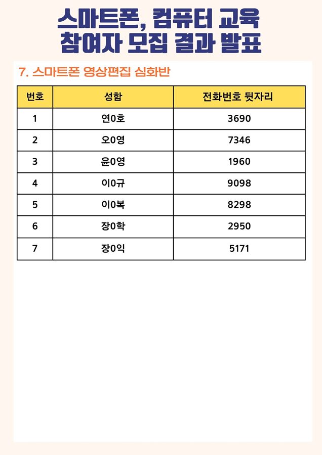 2023년 스마트폰, 컴퓨터 참여자 모집 결과 안내드립니다! 아직 정원을 넘지 않은 스마트폰 초급 2반, 스마트폰 초급 3반, 스마트폰 활용 3반, 스마트폰 영상 편집 기초반, 심화반,인터넷활용반은 선착순으로 추가 접수 받고있으니 관심있으시면 복지관 1층 사무실 방문 또는 전화(043-216-9810) 주세요