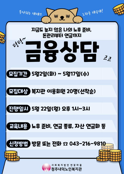 청주내덕노인복지관에서는 5월22일 월요일, 오후1시부터 3시까지 금융상담이 진행 예정입니다.