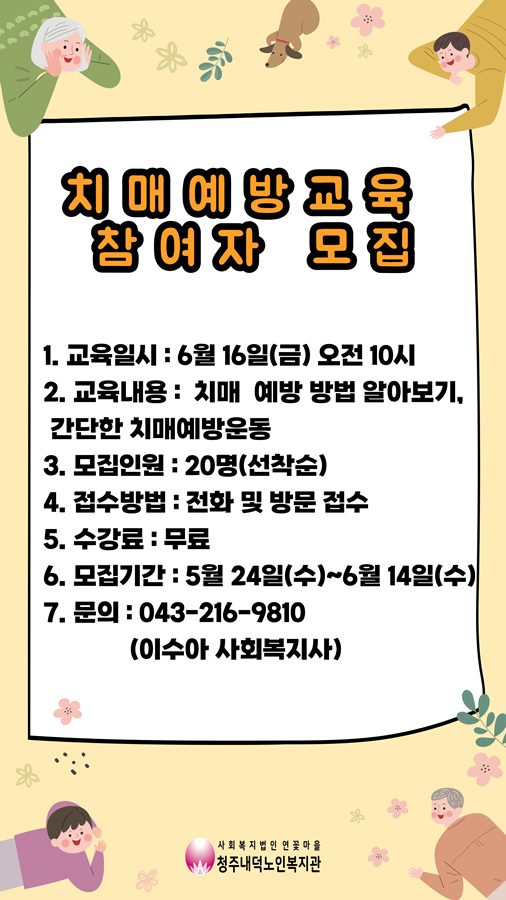 6월 16일(금) 오전 10시 치매예방 교육을 진행할 예정입니다. 치매, 치매예방방법에 대해 알아보는 시간과 간단한 치매예방운동에 대해 배우고 직접 운동해보는 시간까지! 알찬 2시간의 강의로 구성된 치매예방교육이므로 많은 관심과 신청 부탁드립니다! 문의 : 문화복지과(043-216-9810) |