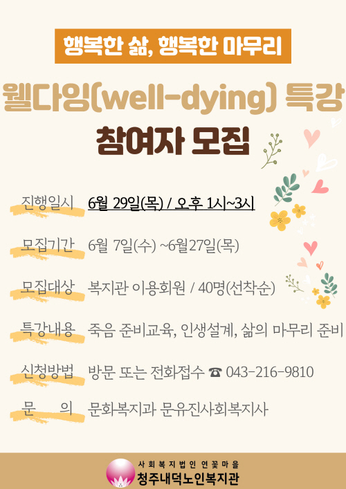 청주내덕노인복지관에서는 6월 29일 목요일, 오후1시부터 3시까지 웰다잉 특강이 진행 예정입니다.