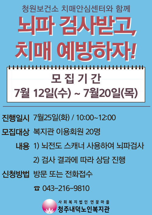 청주내덕노인복지관에서는 7월25일 화요일, 오전10시부터 12시까지 청원보건소 치매안심센터와 함께 뇌전도 스캐너를 사용한 뇌파검사를 통해 치매 검사가 진행 예정입니다.