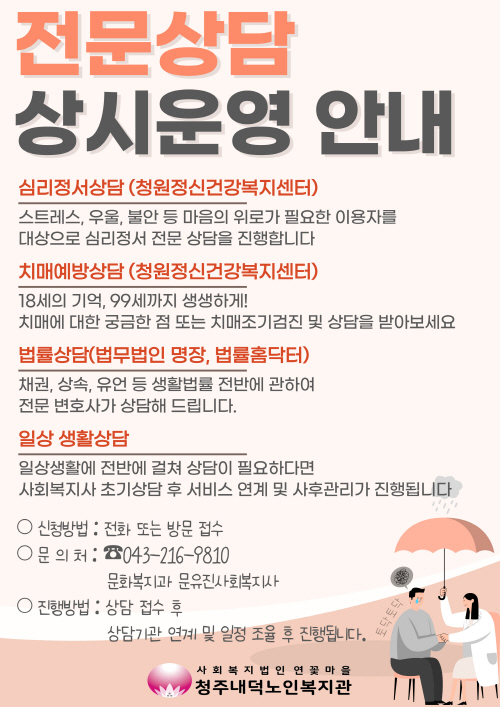 | 청주내덕노인복지관 2023년 전문상담 상시운영 안내 | |||