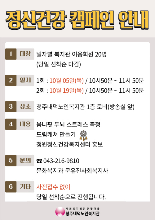 청주내덕노인복지관에서는 10월5일(목)과 10월19일(목) 10시50분부터 11시50분까지 총 2회기에 걸쳐 정신건강캠페인이 진행됩니다.