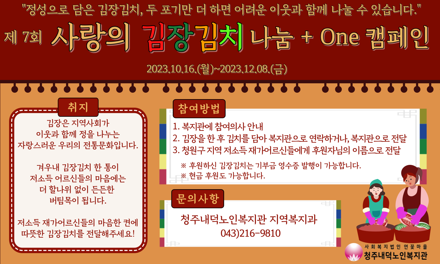 청주내덕노인복지관에서는 우리의 김치, 그리고 김장문화 나눔과 지역사회에 어려운 이웃을 돕기 위해 김장김치 나눔 + One 캠페인을 통해 나눔의 정을 이어가고자 합니다.