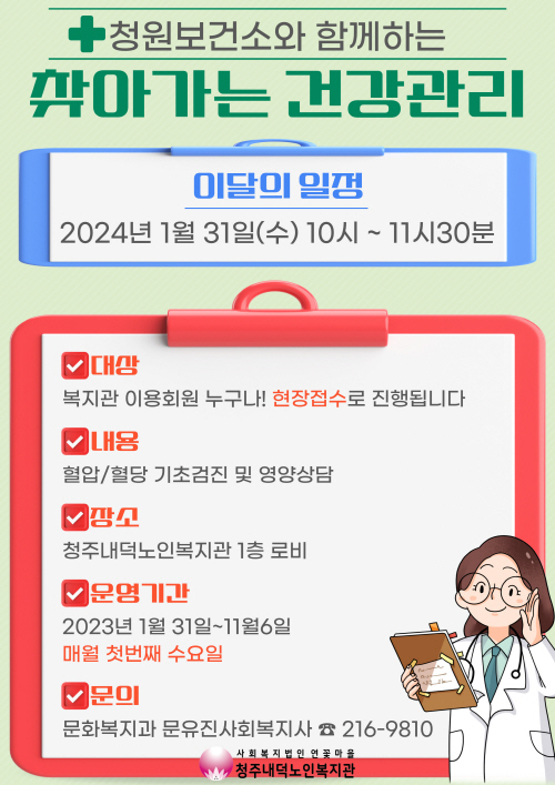 청주내덕노인복지관에서는 1월31일(수) 10시부터 11시30분까지 찾아가는 복지관 건강관리가 진행됩니다.