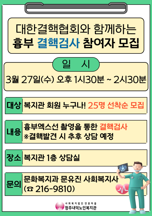 청원보건소-대한결핵협회와 함께 흉부엑스선 촬영을 통한 결핵검사가 진행됩니다.