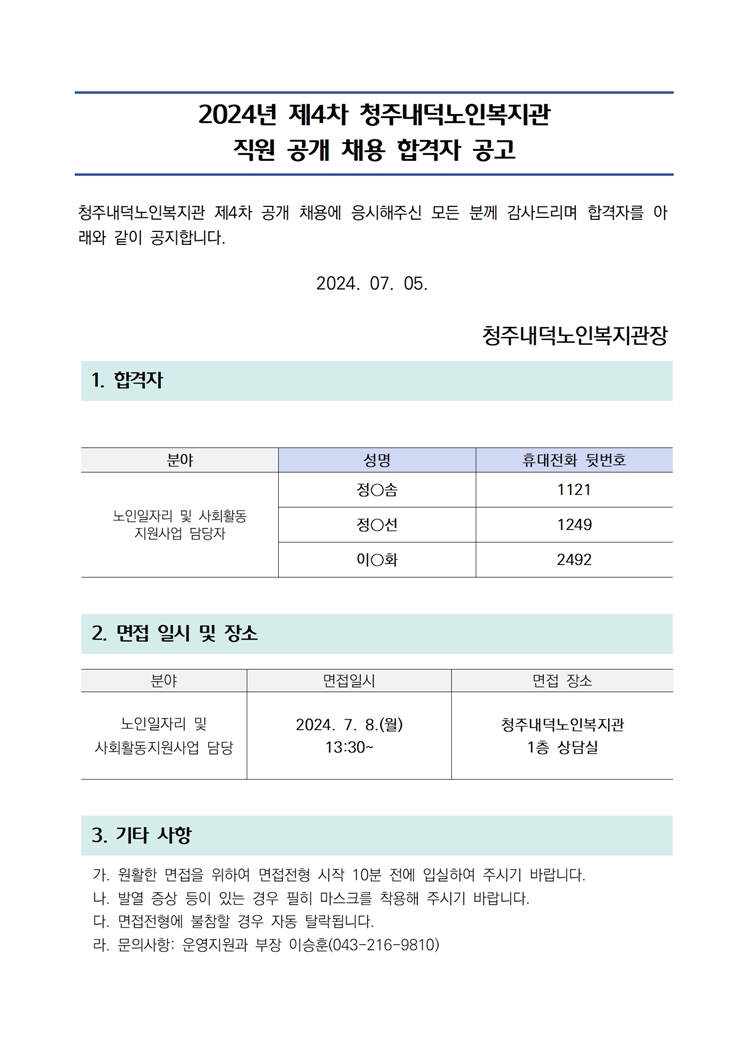| 2024년 제4차 직원 공개채용 서류전형 합격자 및 면접 안내 | |||