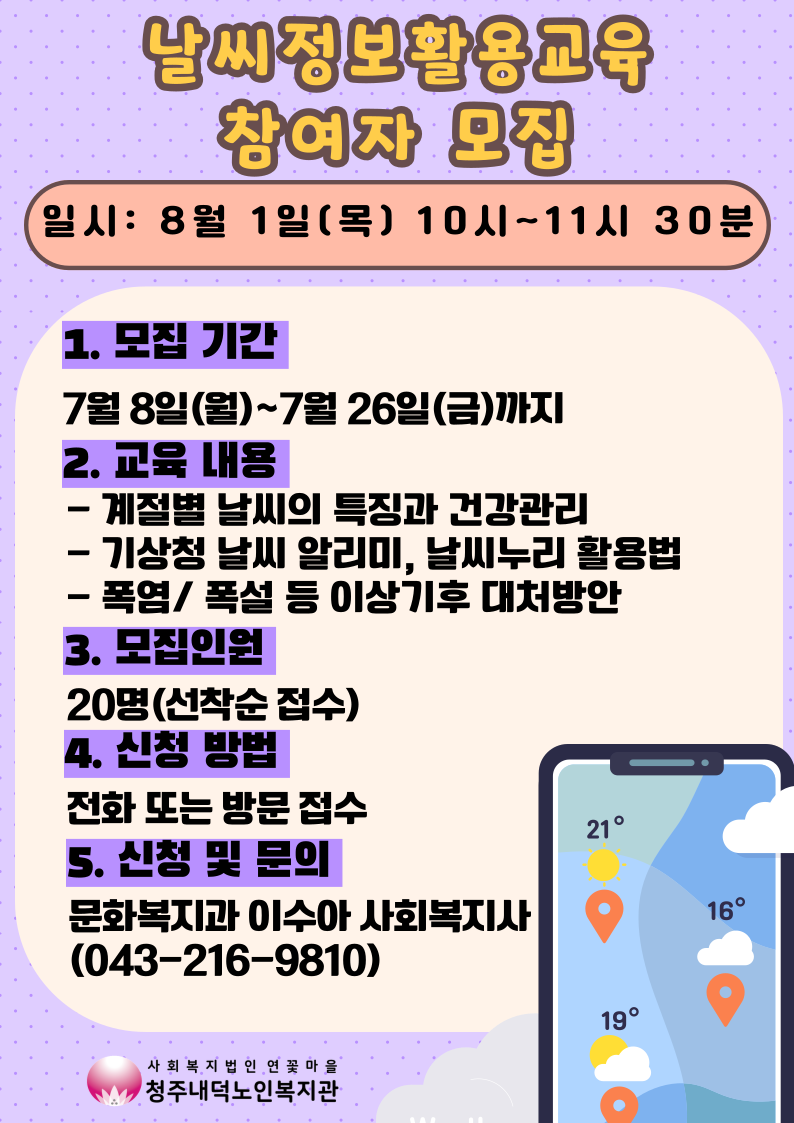 이번 교육은 기상기후인재개발원과 연계하여 진행되며 전문 강사님이 오셔서 계절별 날씨의 특징과 건강관리, 기상청 날씨 알리미, 날씨누리 활용법, 폭염/폭설 등 이상기후 대처방안에 대해 알려주실 예정입니다. 교육 참여를 희망하는 분은 복지관에 전화 신청(043-216-9810) 또는 복지관 1층 사무실에 방문하여 신청바랍니다. 많은 관심와 참여바랍니다!