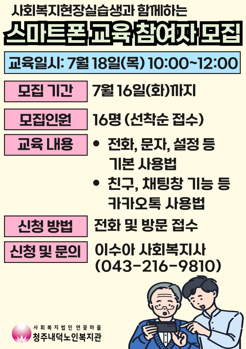 복지관에서 7월 16일(화)까지 사회복지현장실습생분들과 함께하는 스마트폰 교육 참여자를 모집합니다. 이번 교육은 7월 18일(목) 10시에 진행하며, 사회복지현장실습생분들이 스마트폰 기본 사용법과 카카오톡 사용법에 대한 교육을 진행할 예정입니다. 관심있으신 분들은 복지관으로 전화(043-216-9810)하시거나 또는 사무실에 내방하여 신청해주시면 됩니다. 많은 관심과 참여부탁드립니다!