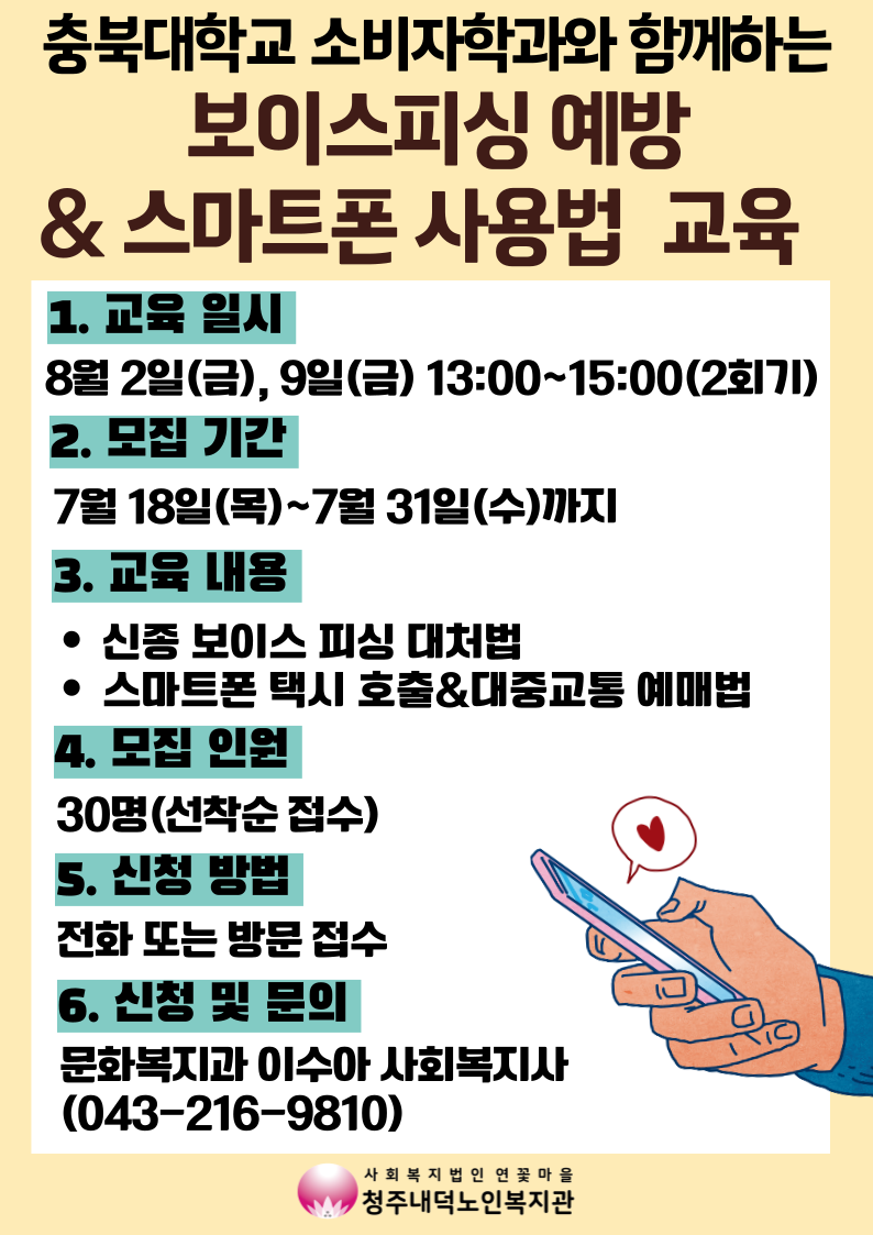 | [모집]충북대학교 소비자학과와 함께하는 보이스피싱예방&스마트폰 사용법 교육 참여자 모집 | |||
