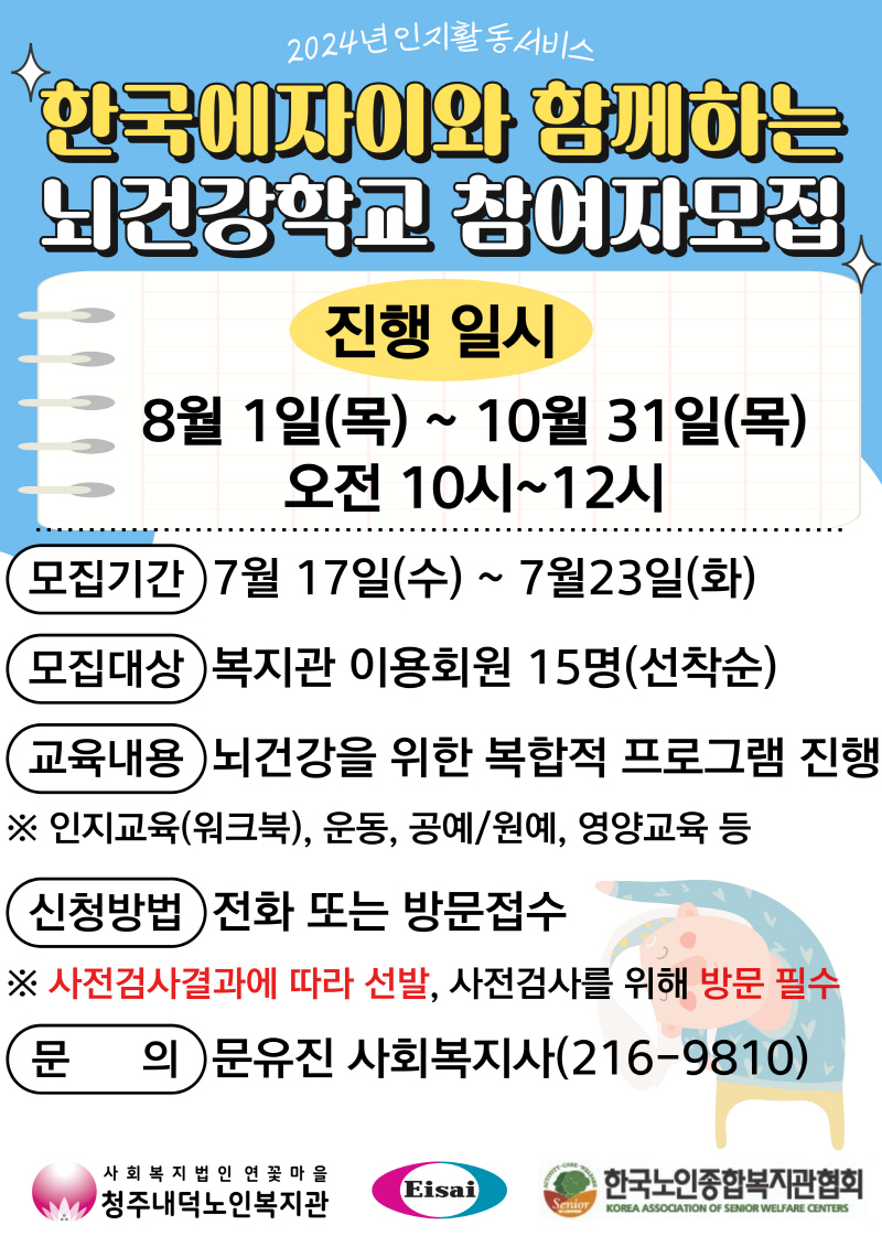 청주내덕노인복지관에서는 한국에자이와 함께하는 뇌건강학교 참여자를 모집합니다. 8월1일부터 10월31일까지 매주 목요일 10시~12시 프로그램이 진행됩니다. 참여자모집은 7월 23일까지 총 15명 선착순 마감으로 진행됩니다. 자세한 내용은 상단의 사진을 참고해주시고 문의사항은 문화복지과(043-216-9810) 문유진사회복지사를 찾아주세요. |