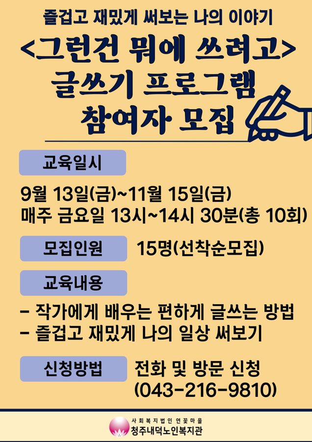 9월 13일부터 11월 15일까지 매주 금요일 13시~14시 30분 10회기로 2024년 사회시설활용 인문프로그램 '그런거 뭐에 쓰려고' 글쓰기 프로그램이 진행됩니다! 본 사업은 청청프로젝트 연구소의 지원으로 진행되며, 현직 작가에게 배우는 편하게 글쓰는 방법과 즐겁고 재밌게 나의 일상을 써보는 방법에 대해 배워볼 예정입니다. 15명 선착순으로 참여자를 모집하오니 신청을 희망하시는 분은 복지관으로 전화하시거나(043-216-9810) 복지관 1층 사무실에 방문하여 신청해주시면 됩니다. 많은 관심과 참여 부탁드립니다!