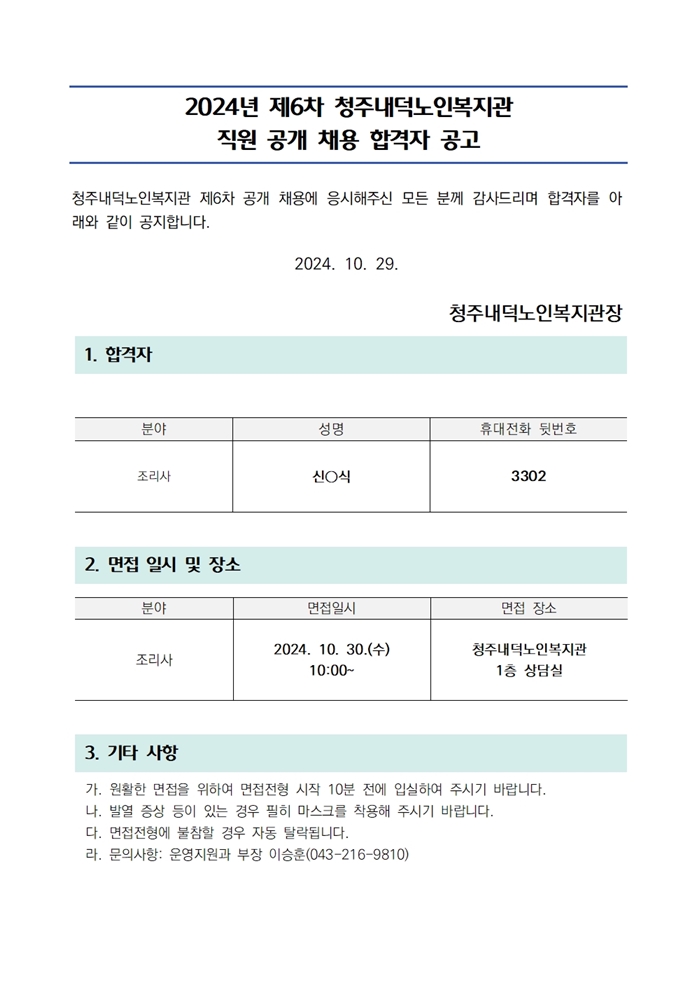 | 2024년 제6차 직원 공개채용 서류전형 합격자 및 면접 안내 | |||