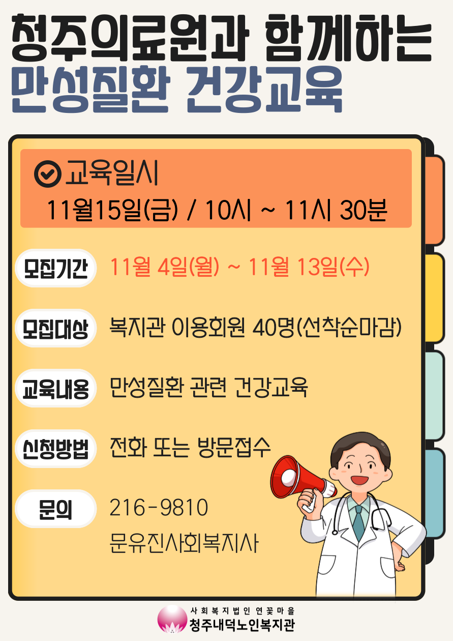청주내덕노인복지관에서는 11월 15일(금) 10시부터 11시30분까지 청주의료원과 함께 만성질환교육이 진행됩니다.