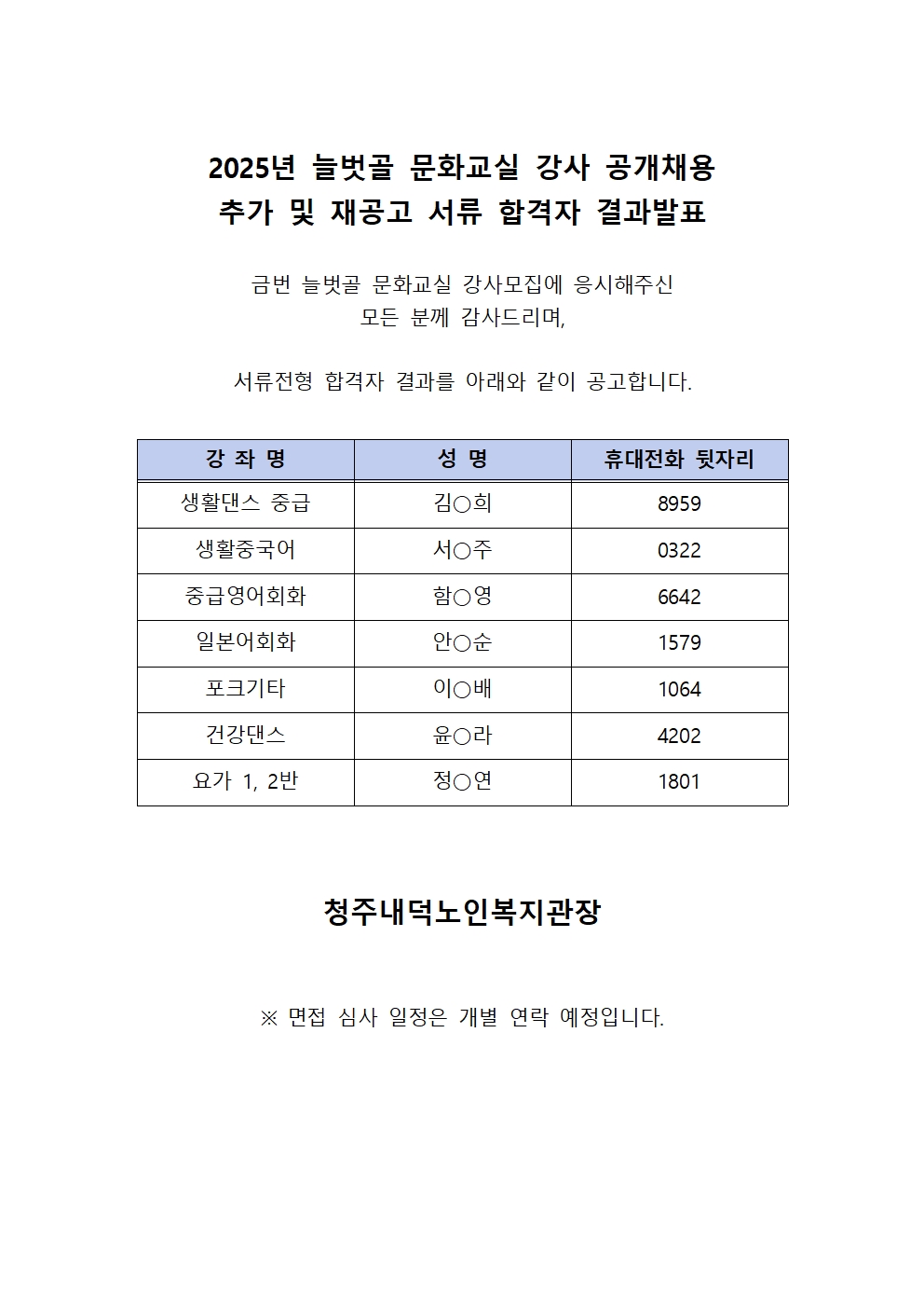 | 2025년 늘벗골 문화교실 강사 공개채용 추가 및 재공고 서류 합격 결과 발표 | |||