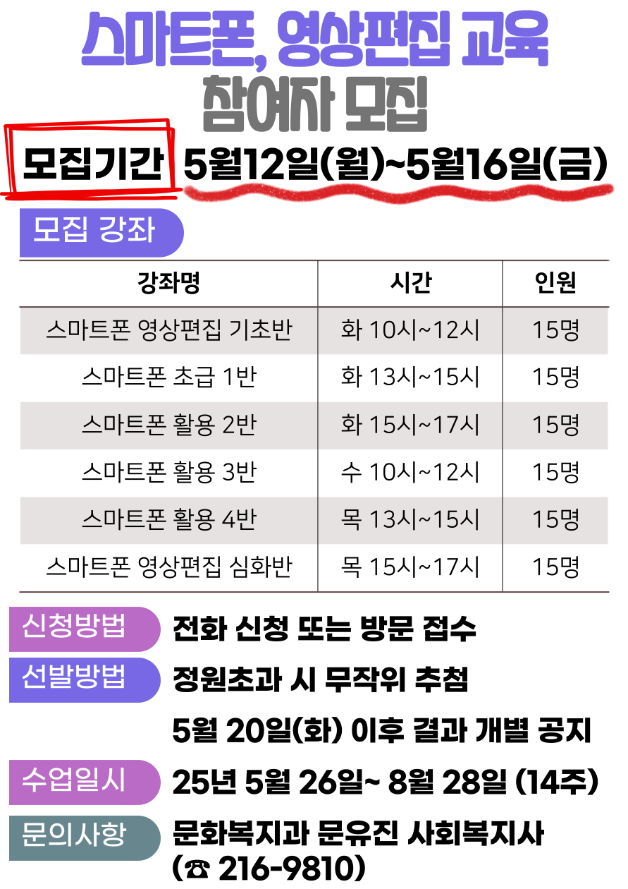 | [모집] 2025년 스마트폰, 영상편집 교육 참여자 모집 | |||