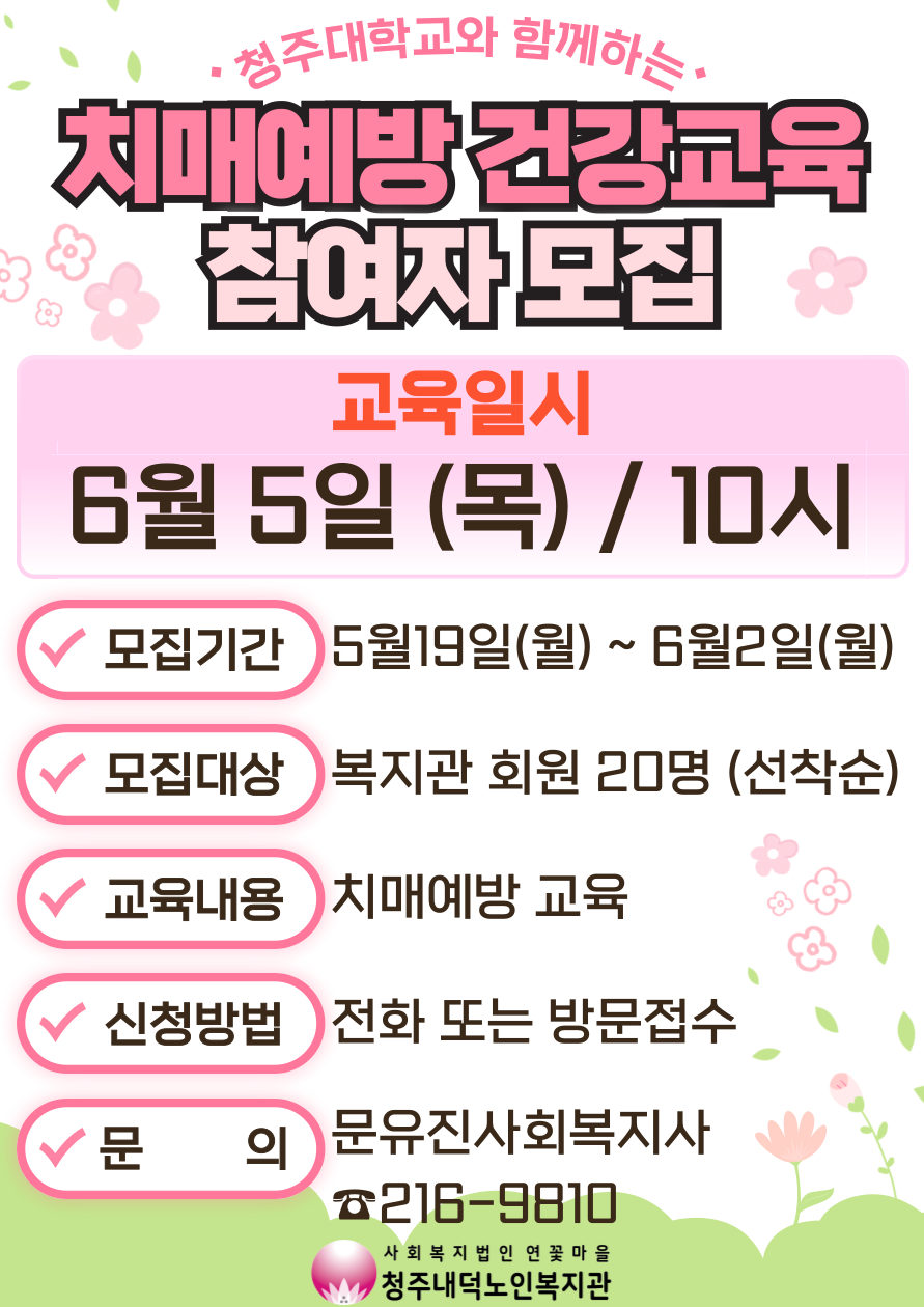 청주내덕노인복지관에서는 6월 5일(목) 오전 10시부터 11시까지 치매예방 건강교육이 진행됩니다.