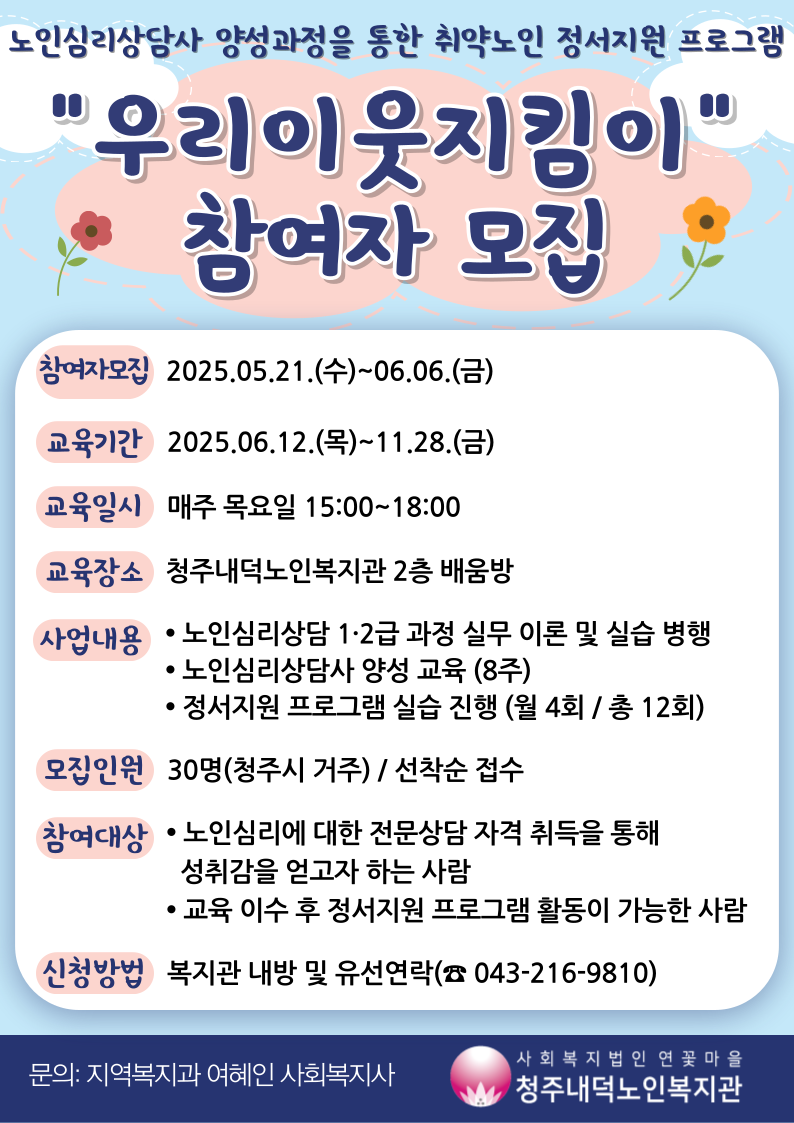 5/21(수)부터 6/6(금)까지 2025년 지역사회돌봄 및 자원연계사업의 일환으로 노인심리상담사 양성과정을 통한 취약노인의 정서지원 프로그램 "우리이웃지킴이" 참여자를 모집합니다. 노인심리상담사 1·2급 통합 자격 과정을 수료한 참여자들은 "우리이웃지킴이"로 임명되어 하반기에 교육 내용을 직접 실천해보는 시간을 갖게 될 예정입니다. 자세한 내용이 궁금하신 분들은 지역복지과 여혜인 사회복지사(043-216-9810)에게 문의해주세요.