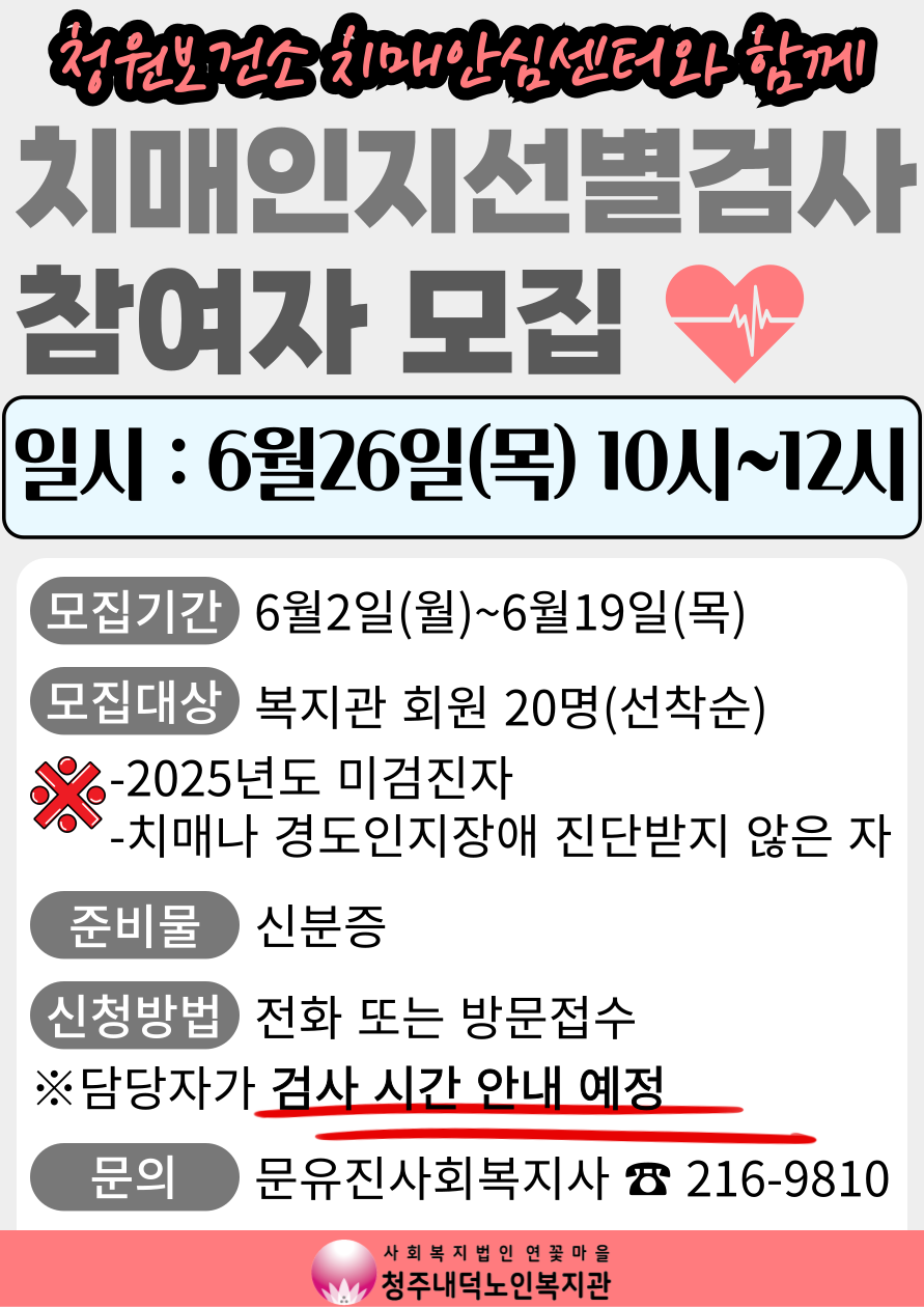 청주내덕노인복지관에서는 6월 26일(목) 오전 10시부터 치매인지선별검사(치매검사)가 진행됩니다.