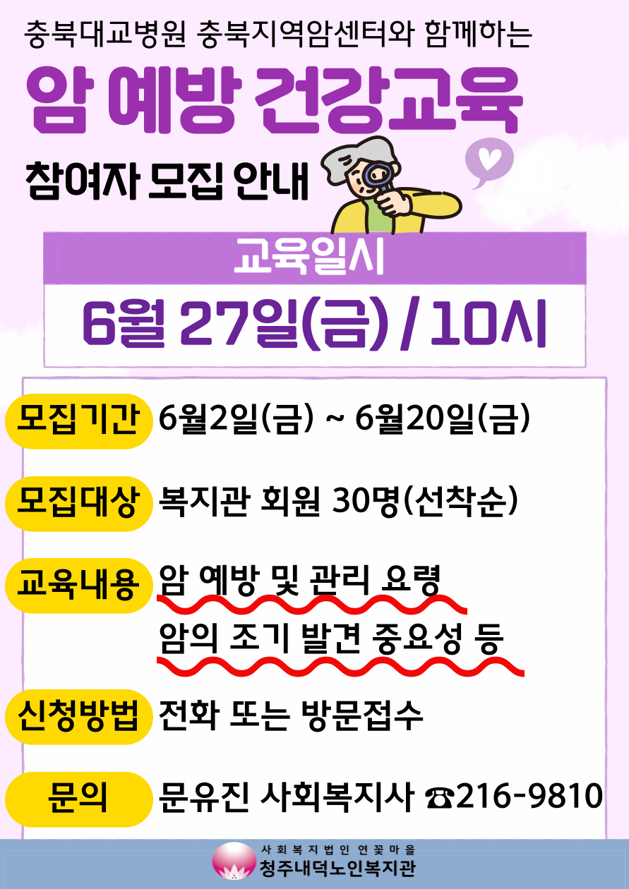청주내덕노인복지관에서는 6월 27일(금) 오전 10시부터 암 예방 및 관리 요령 건강교육이 진행됩니다.