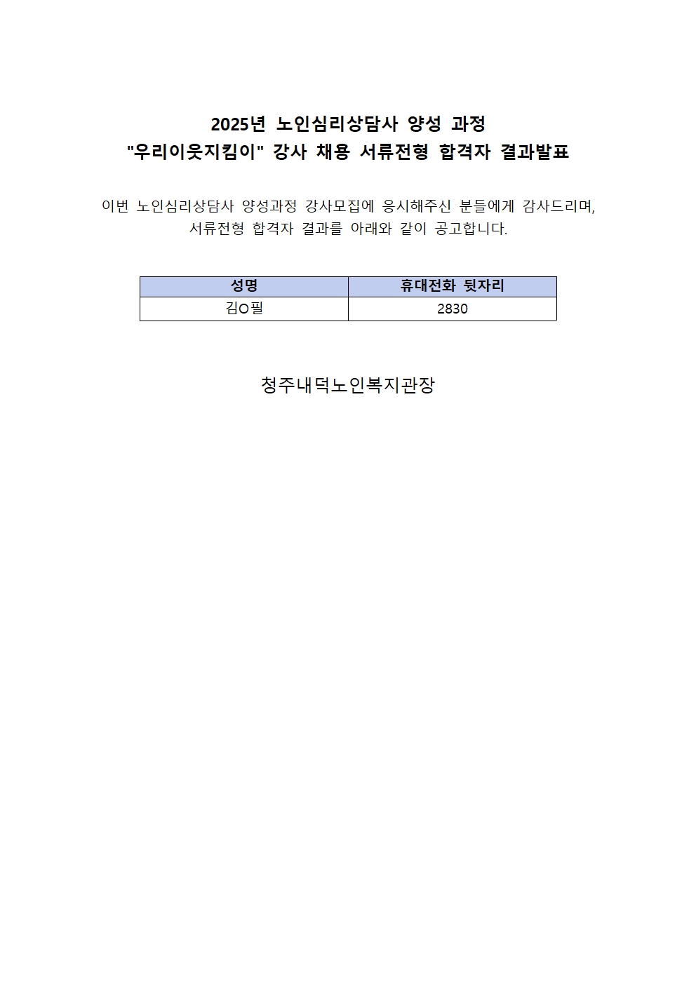 | 2025년 노인심리상담사 양성과정 강사 공개채용 서류 합격 결과 발표 | |||