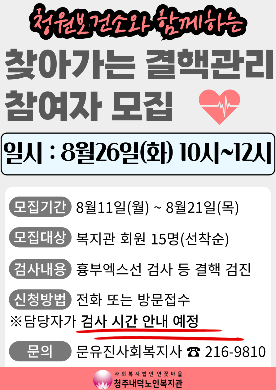 청주내덕노인복지관에서는 8월 26일(화) 오전 10시부터 청원보건소와 함께 찾아가는 결핵관리 검진이 진행됩니다.