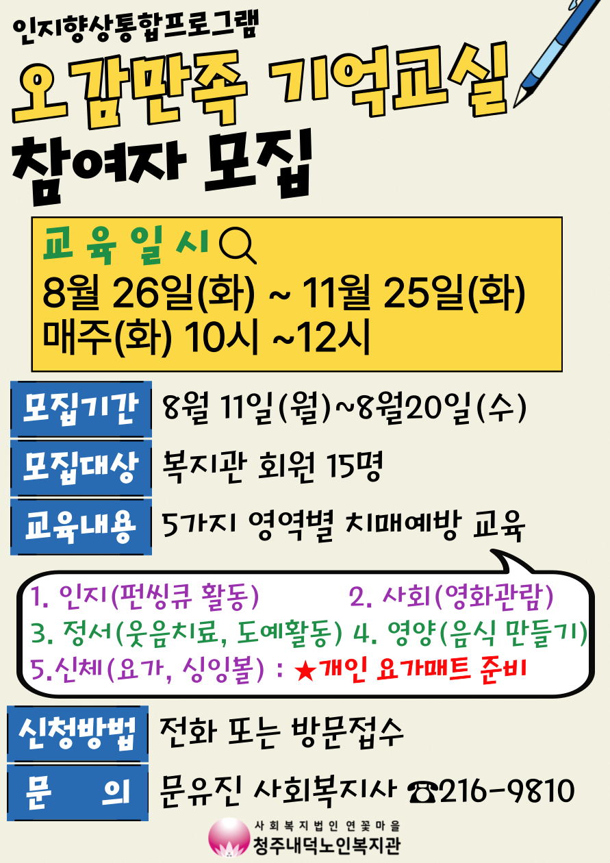 청주내덕노인복지관에서는 8월 26일(화)~11월 25일(화) 까지 매주 화요일 오전 10시~12시, 총 12번의 프로그램이 진행되는 인지향상통합프로그램 오감만족 기억교실 프로그램이 진행됩니다. 참여자모집은 8월 20일까지, 총 20명 선착순 접수로 진행됩니다. 프로그램은 인지, 사회, 정서, 영양, 신체 등 5가지 영역으로 나누어 진행되며 요가매트는 개별적으로 준비가 꼭! 필요합니다. 자세한 내용은 사진을 참고해주시고 문의사항은 문화복지과(043-216-9810) 문유진사회복지사를 찾아주세요.