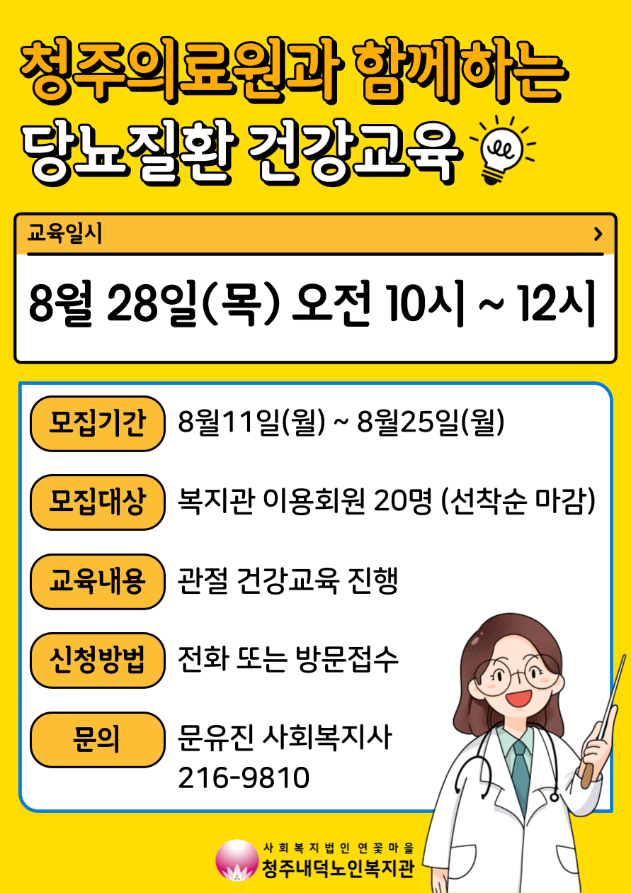 청주내덕노인복지관에서는 8월 28일(목) 오전 10시부터 청주의료원과 함께하는 당뇨질환 건강교육이 진행됩니다. 참여자 모집은 8월25일까지이며, 총 20명 선착순 접수로 진행됩니다. 자세한 내용은 사진을 참고해주시고 문의사항은 문화복지과(043-216-9810) 문유진사회복지사를 찾아주세요.