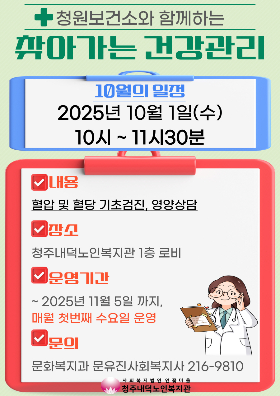 청주내덕노인복지관에서는 10월 1일(수) 10시 찾아가는 복지관 건강관리인 청원보건소와 함께 진행되는 혈압과 혈당검사 및 영양상담이 진행됩니다. 사전접수가 아닌 당일 현장접수로 순차적으로 진행되며, 11시30분까지 진행되는 점 참고 부탁드립니다. 복지관 이용회원님들의 꾸준한 건강관리를 위해 찾아가는 복지관 건강관리는 11월까지 매월 첫번째주 수요일마다 진행되오니 일정에 참고바랍니다. 자세한 내용은 사진을 참고해주시고 문의사항은 문화복지과(043-216-9810) 문유진사회복지사를 찾아주세요.