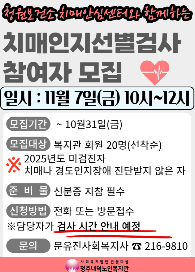 청주내덕노인복지관에서는 11월 7일(금) 10시 청원보건소 치매안심센터와 함께 치매인지선별검사(치매검사)가 진행됩니다. 참여자모집은 10월 31일까지 총 20명 선착순 마감으로 진행됩니다. 단, 2025년도 미검진자와 치매나 경도인지장애 진단을 받지않은 참여자에 한해 접수가 가능하오니 양해바랍니다. 자세한 내용은 사진을 참고해주시고 문의사항은 문화복지과(043-216-9810) 문유진사회복지사를 찾아주세요.