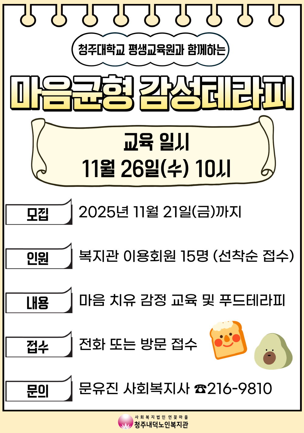 청주내덕노인복지관에서는 11월 26일(수) 10시 청주대학교 평생교육원과 함께하는 마음균형 감성테라피가 진행됩니다. 본 교육은 마음 치유 감정 이론교육과 함께 푸드테라피가 진행됩니다. 참여자 모집은 11월 21일(금)까지 총 15명 선착순 접수로 진행됩니다. 자세한 내용은 사진을 참고해주시고 문의사항은 문화복지과(043-216-9810) 문유진사회복지사를 찾아주세요.